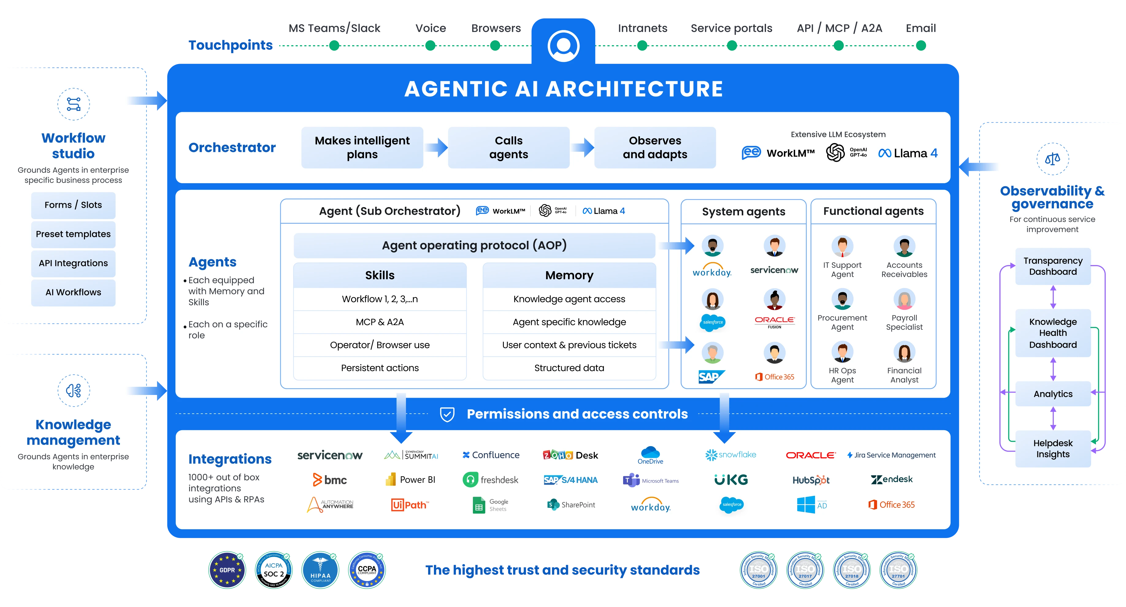 All-in-one Agentic AI architecture for enterprise useFlexible architecture supporting all employee-facing use cases across enterprise systems.